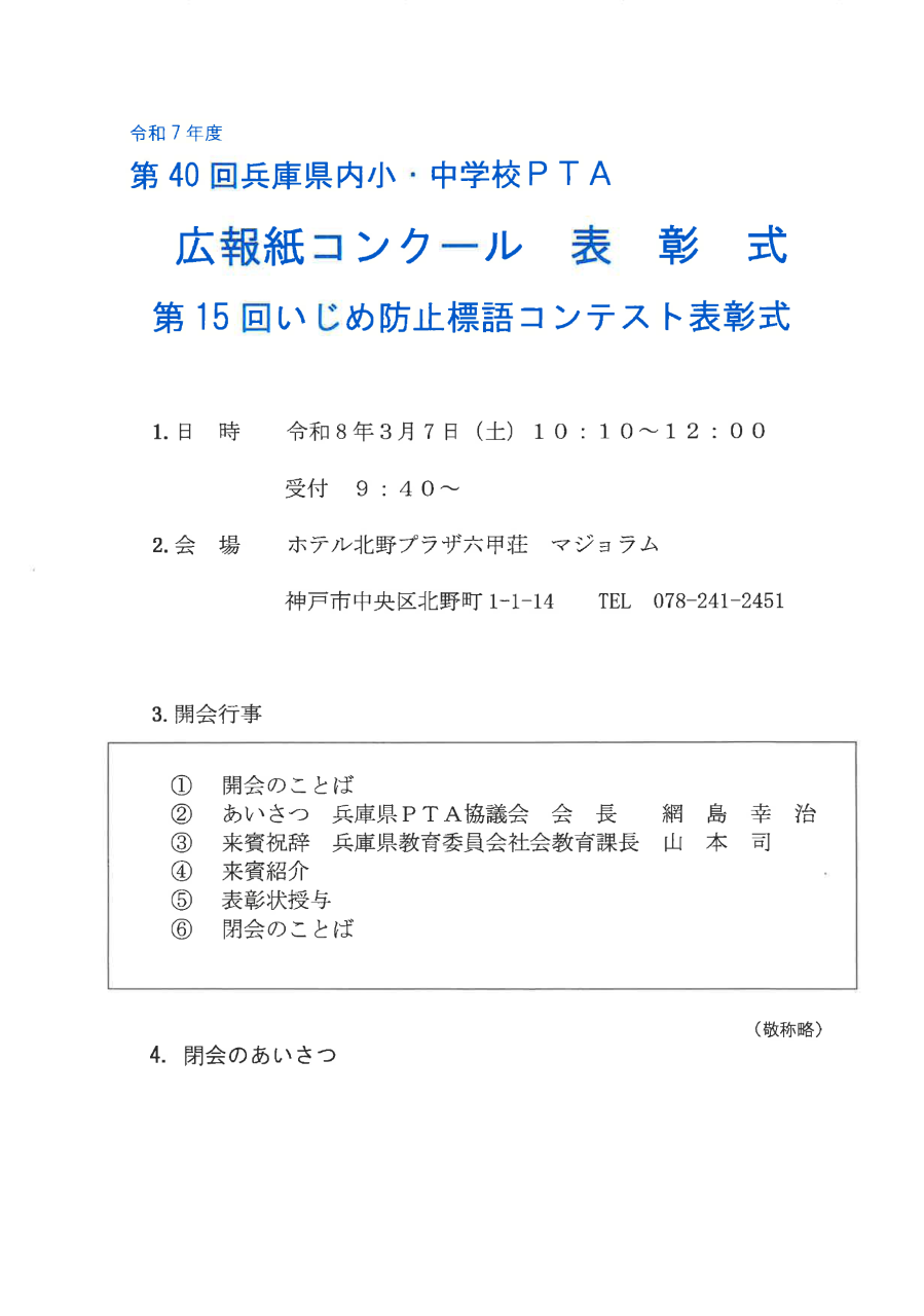 第40回兵庫県内小・中學校PTA広報紙コンクール表彰式 および 第15回いじめ防止標語コンテスト表彰式